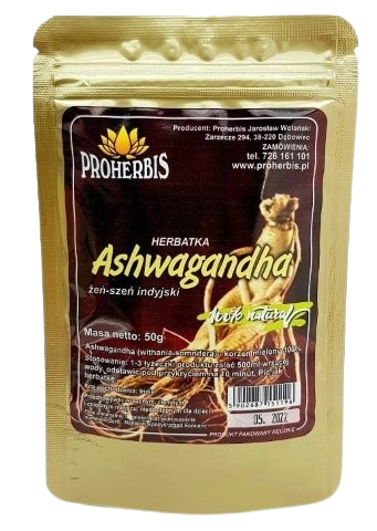 Opakowanie: Herbatka Proherbis Ashwagandha jest starannie zapakowana w wygodne opakowanie o wadze 50g, co zapewnia łatwość przechowywania i użytkowania.