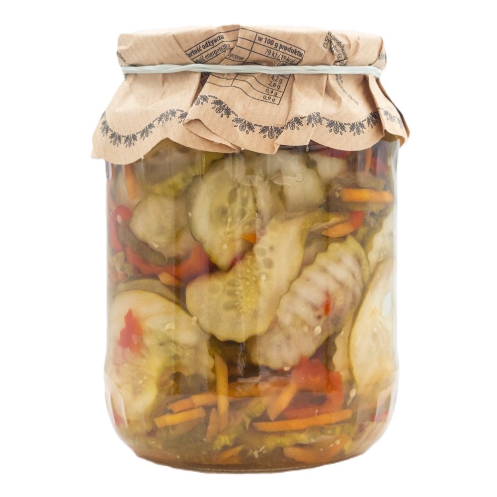 Ogórki, woda, papryka czerwona, ocet spirytusowy, cebula, marchew, cukier, sól, naturalne przyprawy.